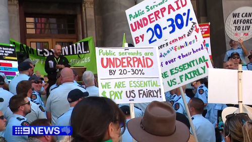 Bugün, Güney Avustralya’daki 2000’den fazla kamu sektörü çalışanı, Parlamento Binası önünde toplanarak 18 ay içinde %20 maaş artışı talep etti.