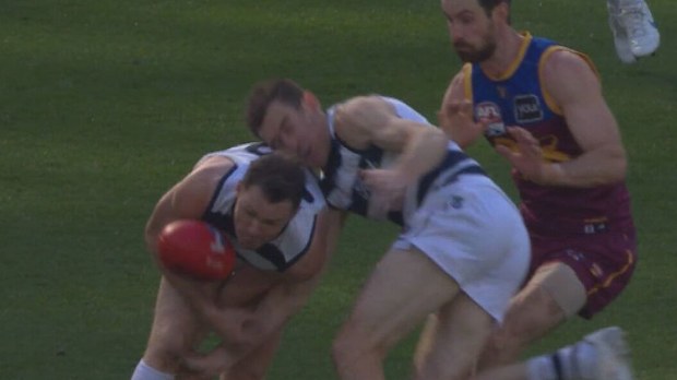 Jeremy Cameron (sağda) ve Patrick Dangerfield çarpışıyor. Seven Network