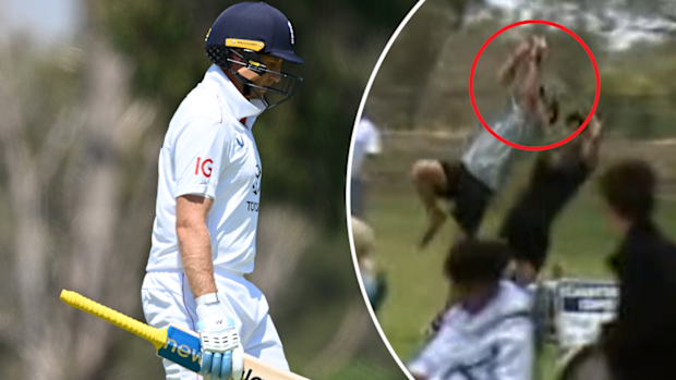 Joe Root oyundan çıkarken; bir taraftar Ben Duckett’in altısını yakaladı. Getty/Nine