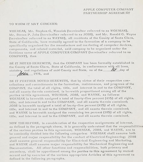 Wozniak ve Jobs, Ronald Wayne’a şirketin ortakları arasında bir denge unsuru olması amacıyla %10 hisse vermişti.