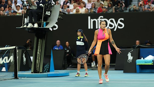 Aryna Sabalenka, hakemin kararına tepki veriyor. Getty