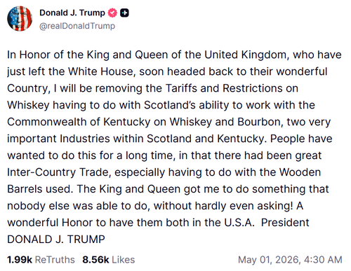 Trump, “Birleşik Krallık’ın Kralı ve Kraliçesi onuruna, Beyaz Saray’dan ayrıldılar ve güzel ülkelerine dönüyorlar. İskoçya’nın Kentucky ile işbirliği içinde çalışmasına dair viski ve bourbon üzerindeki tarifeleri kaldıracağım,” ifadelerini kullandı.