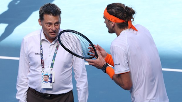 Alexander Zverev, grand slam denetleyicisi Andreas Egli ile konuşuyor. Getty